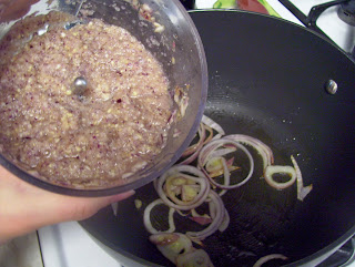 2. Heat the vegetable oil in a skillet over medium-high heat. Add the sliced onion and cook until golden, four to five minutes. Add the spice paste and cook, stirring, until slightly dry, 8 to 10 minutes.